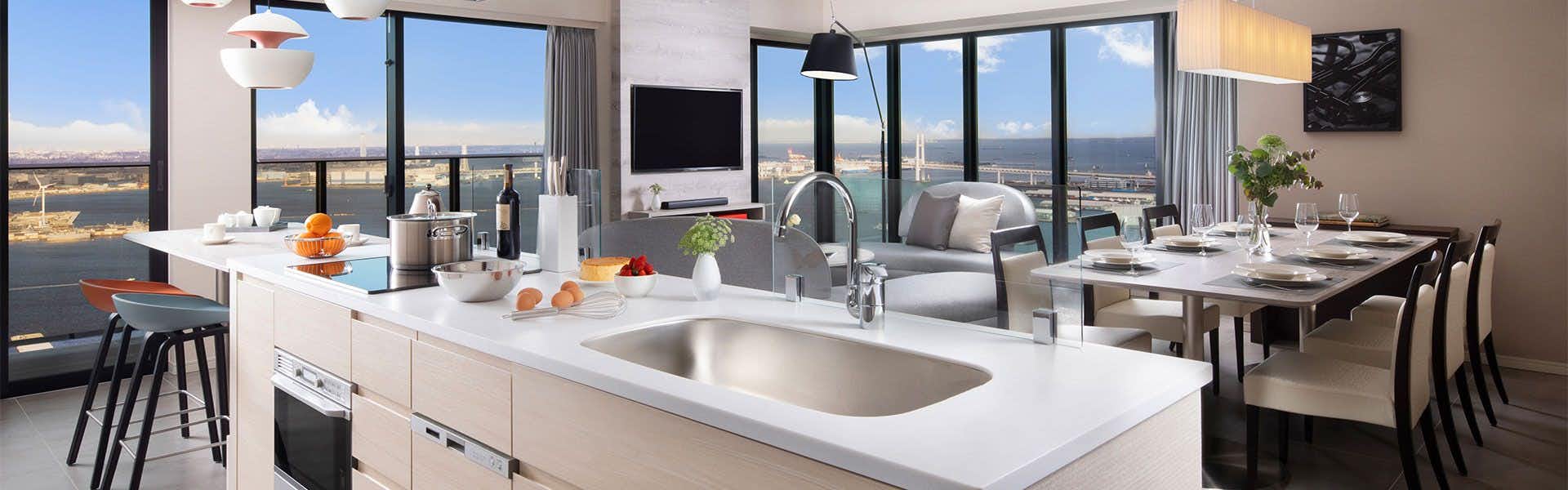 オークウッドスイーツ横浜は食器や調理器具が備えられたフルキッチンをはじめ、家具家電が完備されたサービスアパートメントタイプのホテルです。